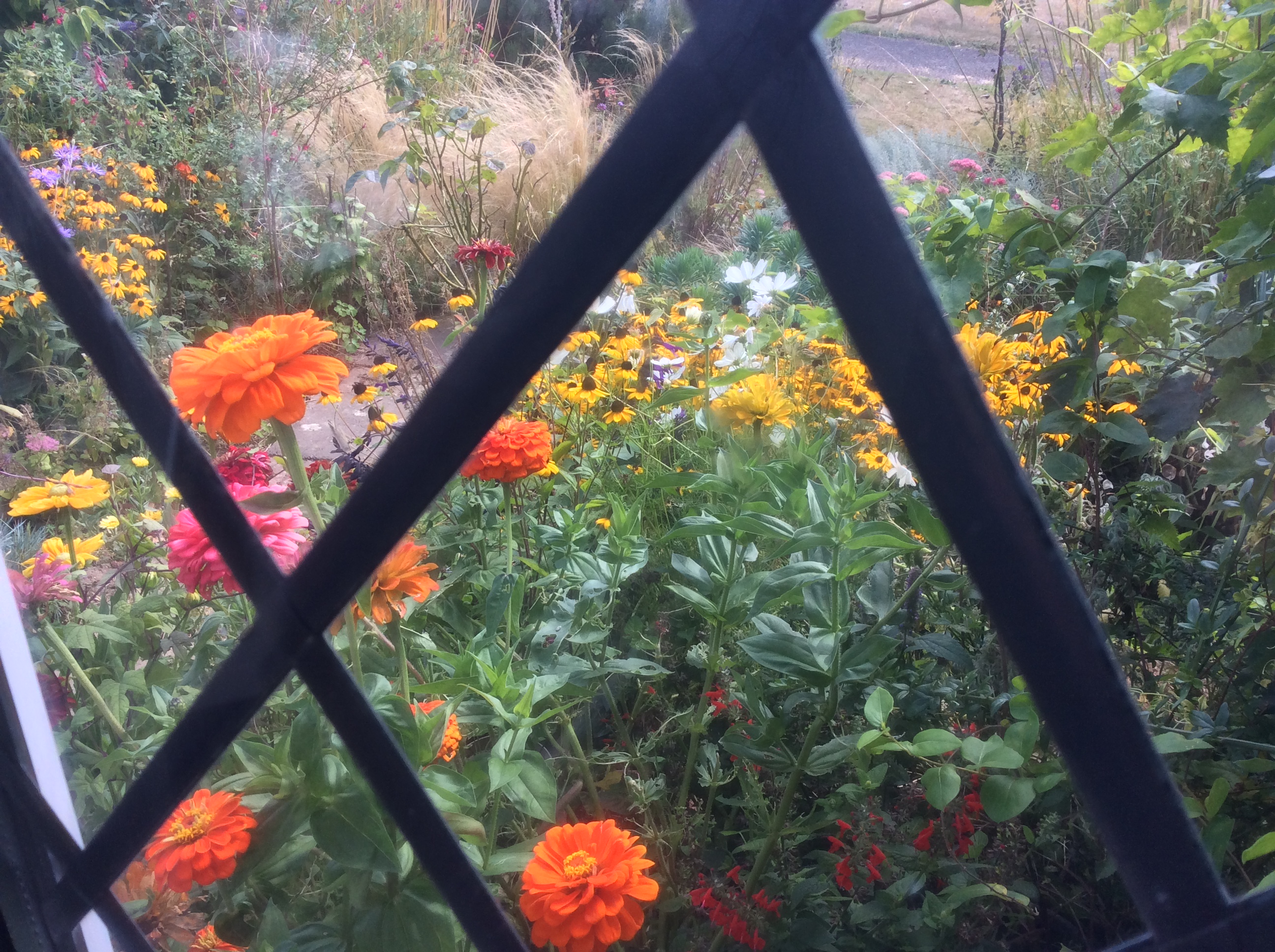 Outside the front door there is the dependable warmth and vibrant colour of the late summer annuals. True to form they show off and catch the attention of busy insects (above photo) and put a smile on our faces at this final flourish of late glory. The best kept till last. These irresistible Rudbeckia ‘Prairie Sun’ flowers live up to their name!
