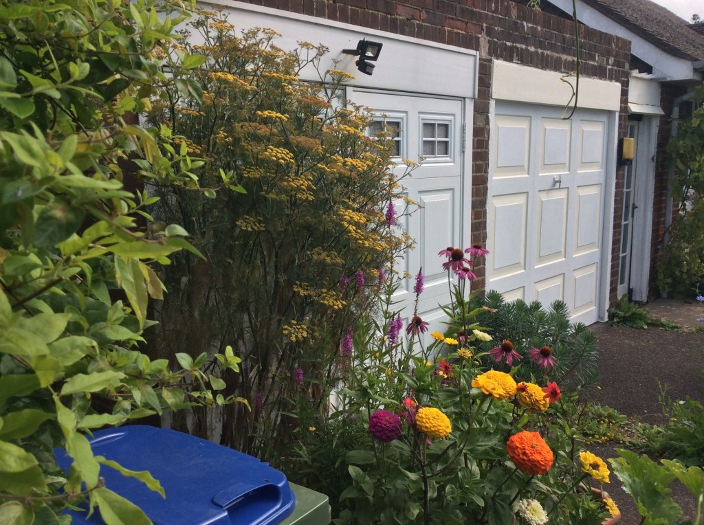 This ‘hot’ pot display of bright coloured annuals, grown from seed, meets you as you arrive.