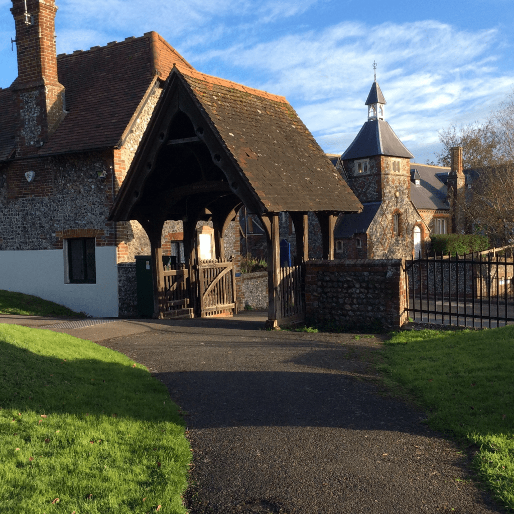 I sit in a secluded back garden, surrounded by trees on a warm day in September’s late summer. In the village below, there is the muffled hum of the inevitable traffic passing through. But every now and then we hear the church clock lazily strike the quarters. It reminds us this village has a past traditional way of life that used to follow the hours by the church clock, at a slower, more gentle way of life. (above old photo from Angmering Village Life)