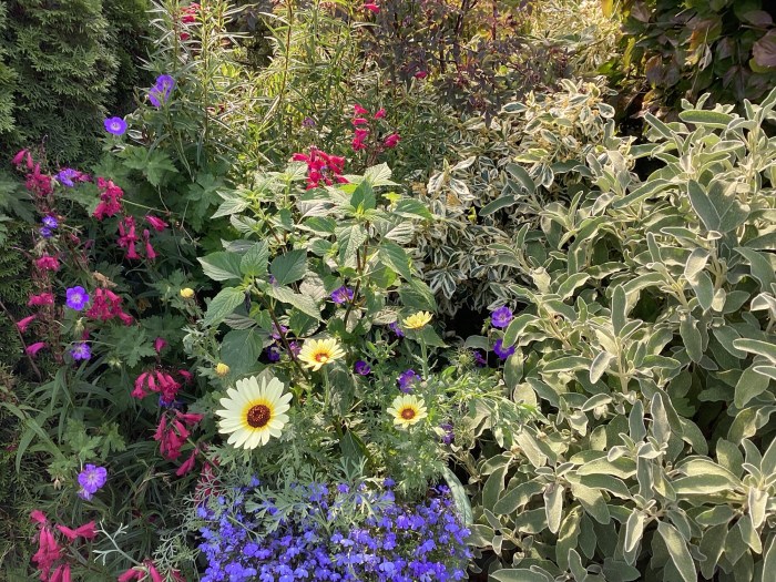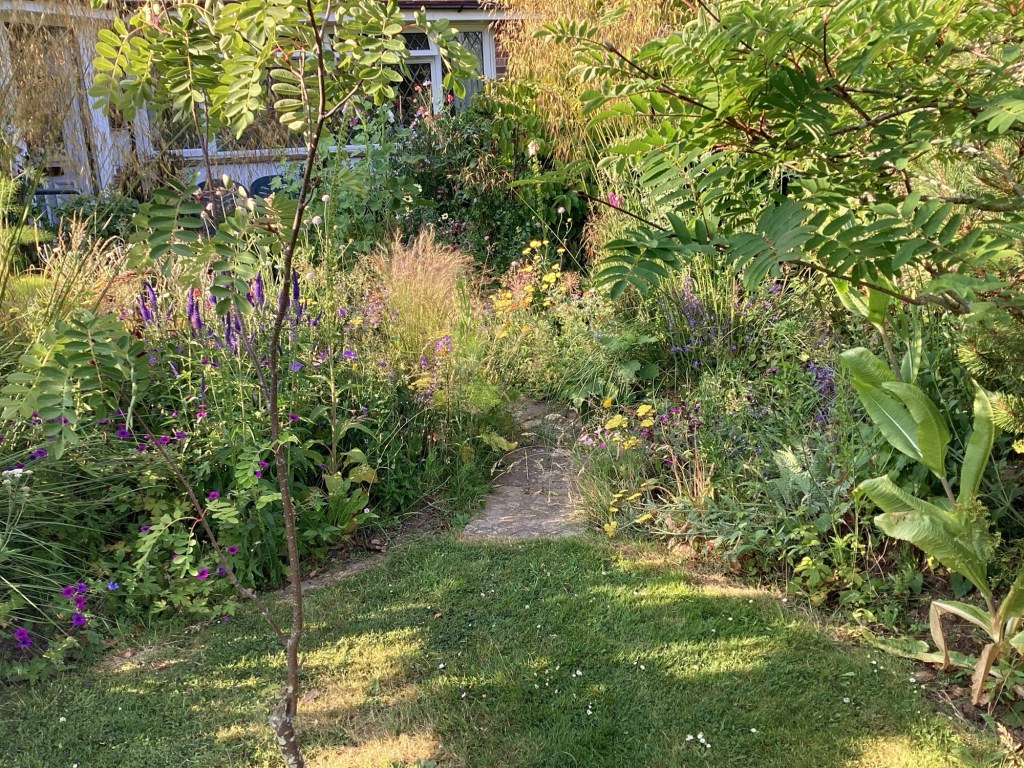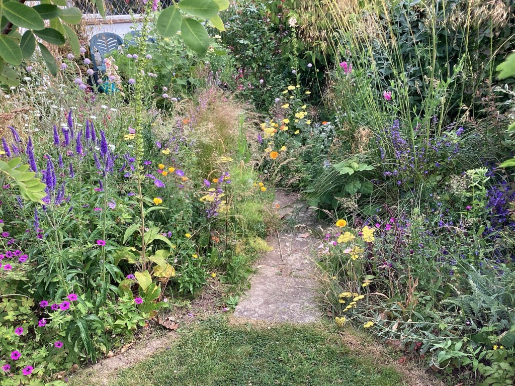 As in any cottage garden, this is a place of playful profusion, a heady colour mix of flowers, softened by feathery grasses. Here you’re immersed in the garden, becoming part of it. Later in the summer this path. may become impassable, and you will find it difficult to avoid treading on flowers that flop over the path. The hum of insects and the waft of scent seems to reflect the fullness of mid-summer’s garden here.