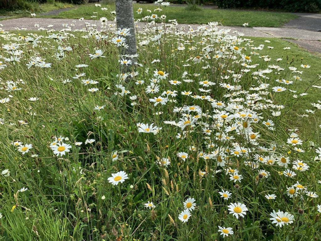 In the front roadside verge we have sown this small hay meadow. In May it was full of oxeye daisies. Now wispy meadow grasses sway graciously in the breeze. The meadow looks after itself before being cut down to set its seed as a hay crop in July/August.