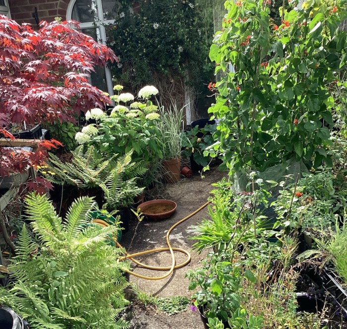 Pass through these trees and you are soon surrounded by an artist’s palette of flowers relaxing in a lazy stillness. This is nature’s slow lane. You can’t rush here. The garden laughs and sings in summer joy. This is a little earthly paradise, my own Eden.